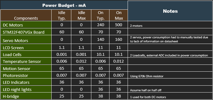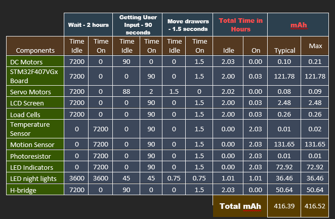 The power budget shows the system requiring a maximum of 416.52 mAh for a complete user interaction cycle.