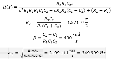 After deriving the transfer function, the gain K_0, bandwidth β, and center frequency ω_0 can be determined: