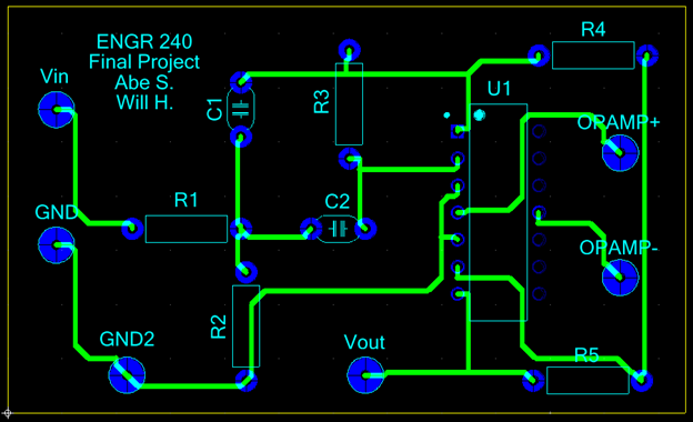 After simulating, the circuit was transferred to a PCB layout in Ultiboard and sent to be fabricated.