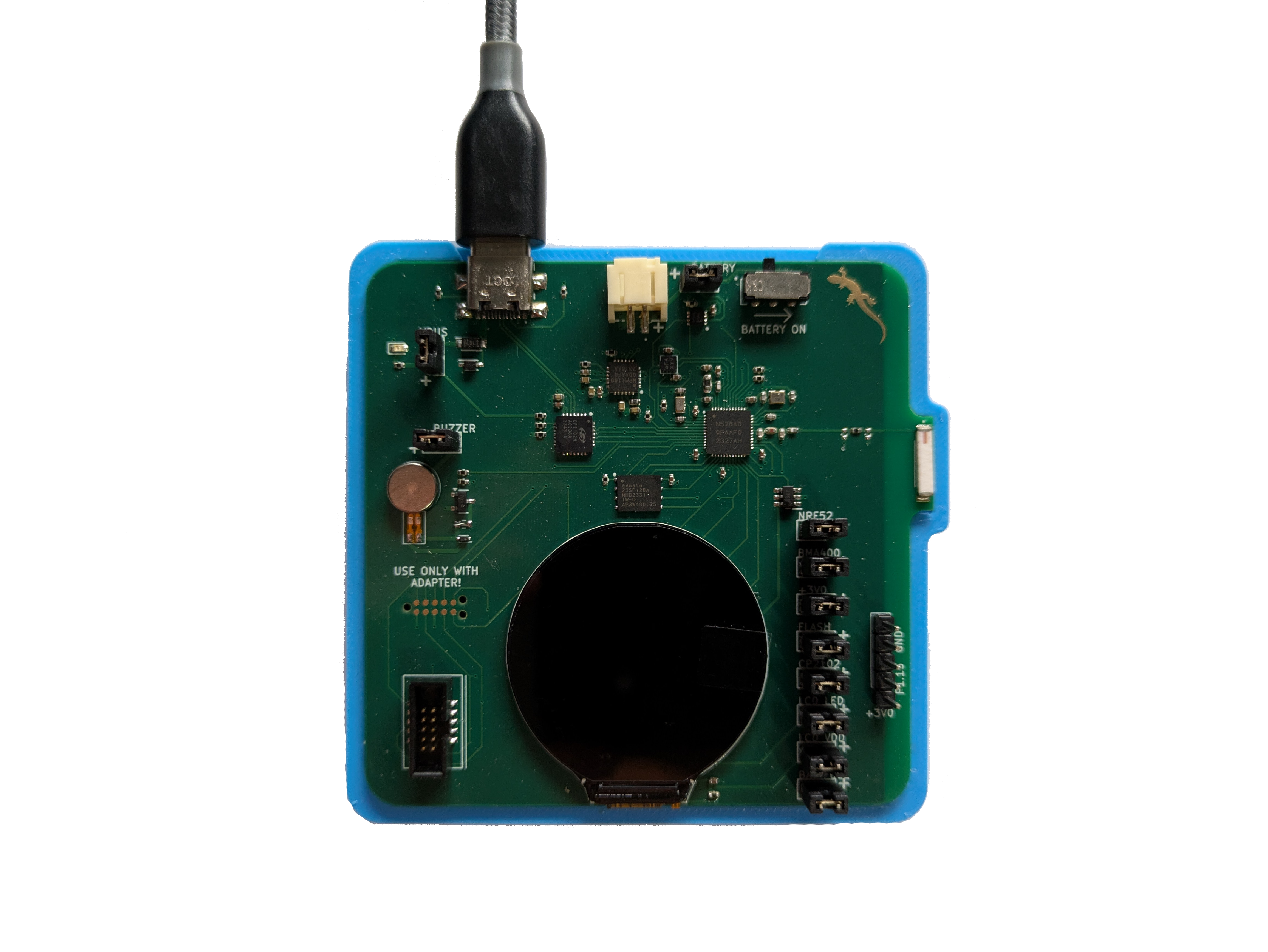 The case of the smartwatch was custom designed to fit the hardware and was made using traditional SLA 3D printing techniques using a biocompatible resin.
