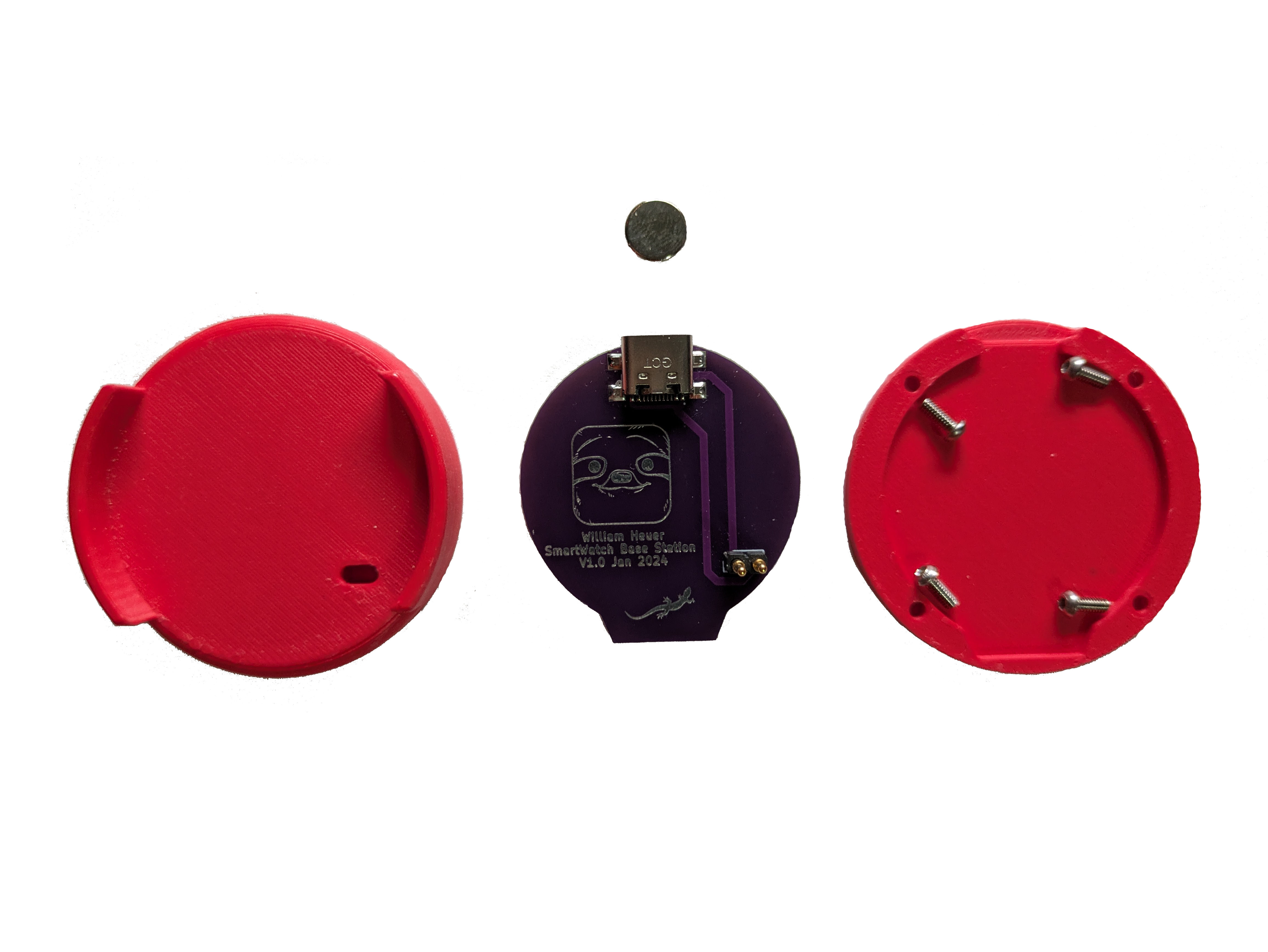 In order to charge the smartwatch without having to disassemble the watch, a pogo-pin based charging system was implemented centered around an external power delivery board. This power delivery board, or charing dock, simply passes power provided through a USB-C connector to a set of pogo-pins that interface with a target on the bottom of the smart watch. In addition, the case of the dock was designed to hold a strong neodymium magnet for easy alignment.