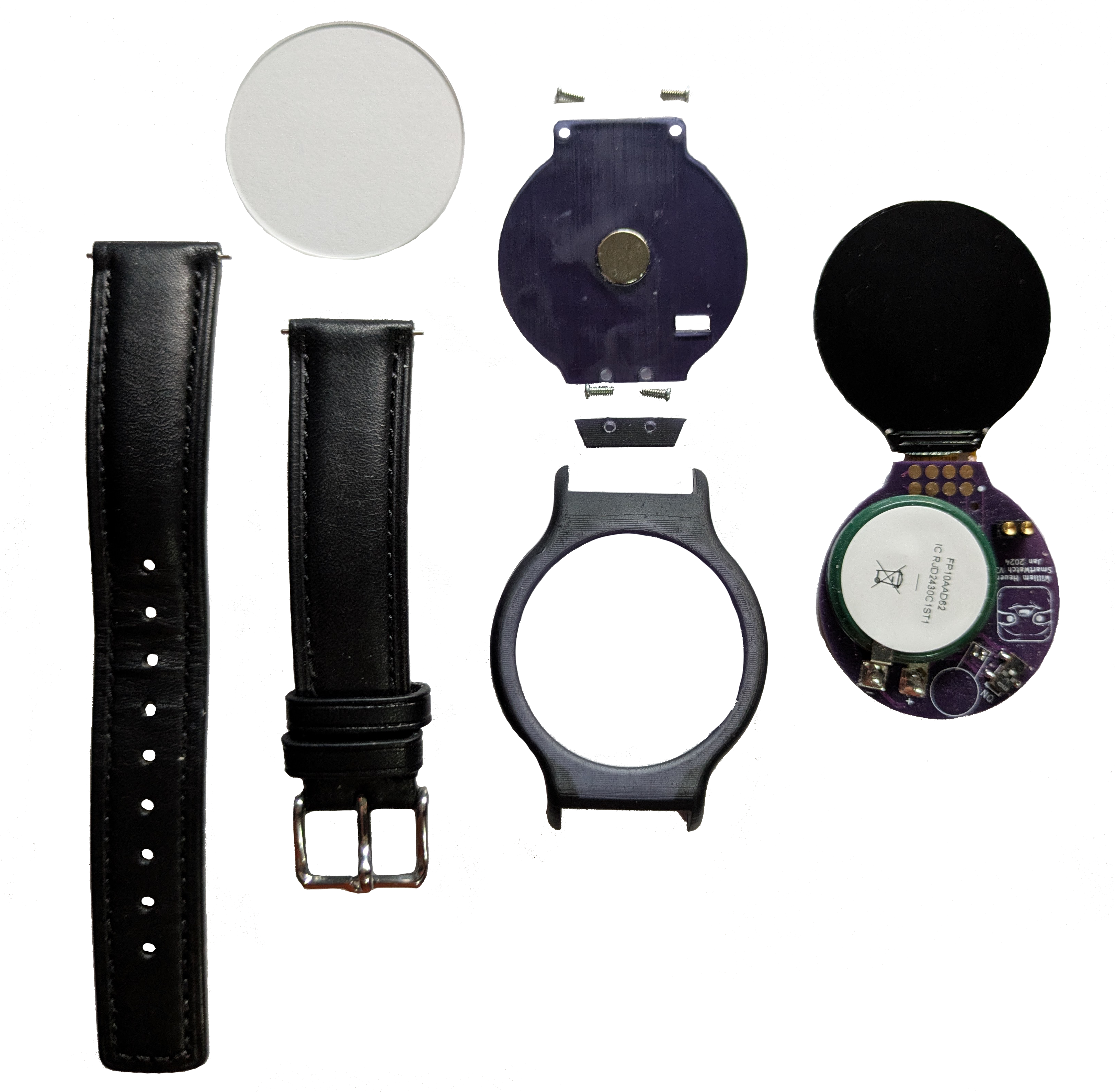These include a watchglass to protect the screen from damage, a standard smartwatch wristband, a small magnet for easy docking, and screws.