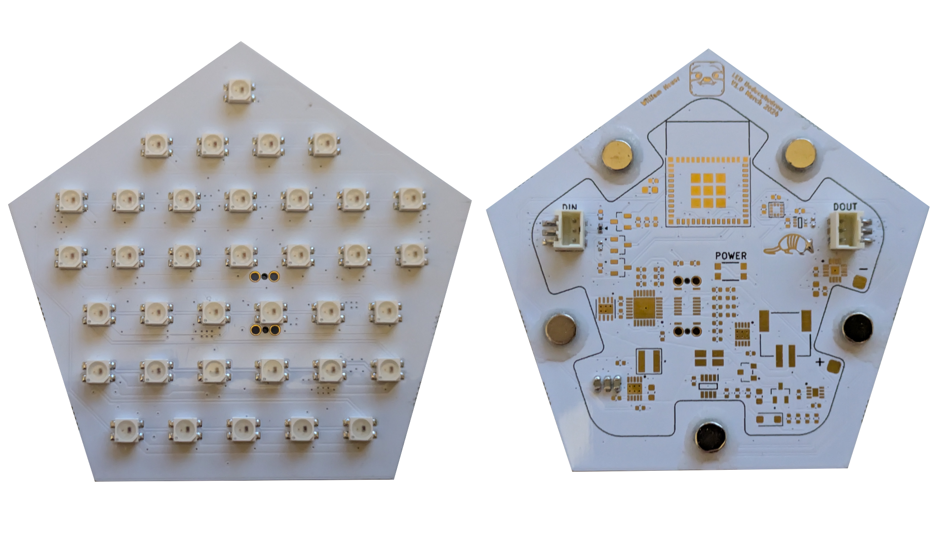Each LED panel contains 36 individually addressable WS2812-MINI RGB LEDs with 432 total RGB LEDs for the whole dodecahedron. Since the LEDs are individually addressable and the constant current driver is contained within the LED package, there is no additional hardware required to drive the LEDs. This configuration allows us to use only a single data line for all the LEDs and greatly simplified the firmware development.